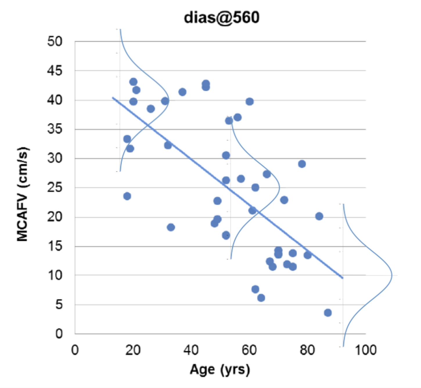 Middle cerebral artery flow velocity decreases with age. When studying subjects with transcranial Doppler, these age-related changes should be taken into account. A recent paper by dr. A. Schaafsma promotes Z-scores as a way to correct for age. Z-scores express the distance in standard deviations to the middle cerebral artery flow velocity expected for age by linear regression.